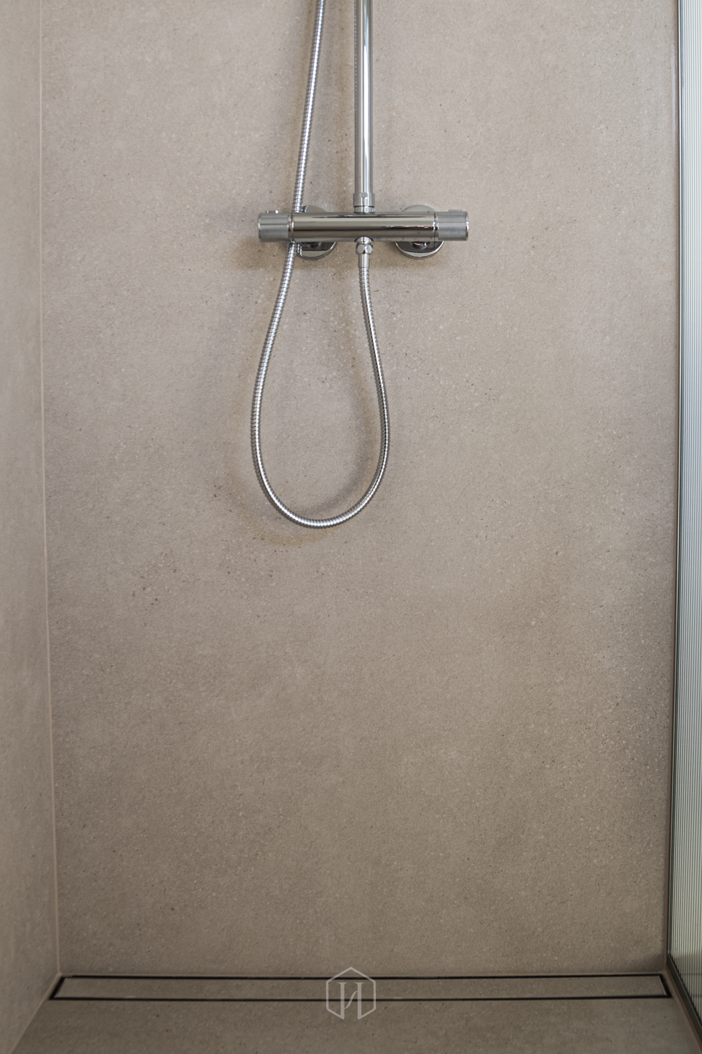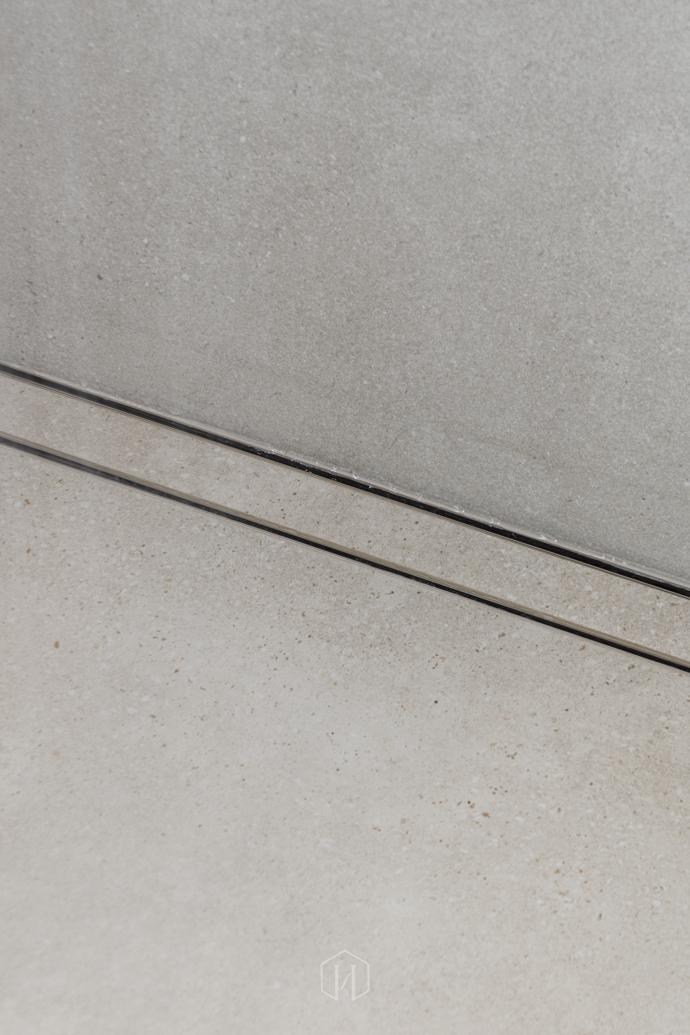 I dusjsonen valgte vi en lineær slukrenne med «flis-i-flis»-deksel, slik at gulvet fremstår som én helhetlig og rolig flate. Sluket ligger helt plan med gulvet og leses bare som en smal, presis spalte – diskret, men teknisk effektiv. Hele løsningen er utført i rustfritt stål med avtagbar innmat, noe som gjør rengjøring og service enkelt i hverdagen.