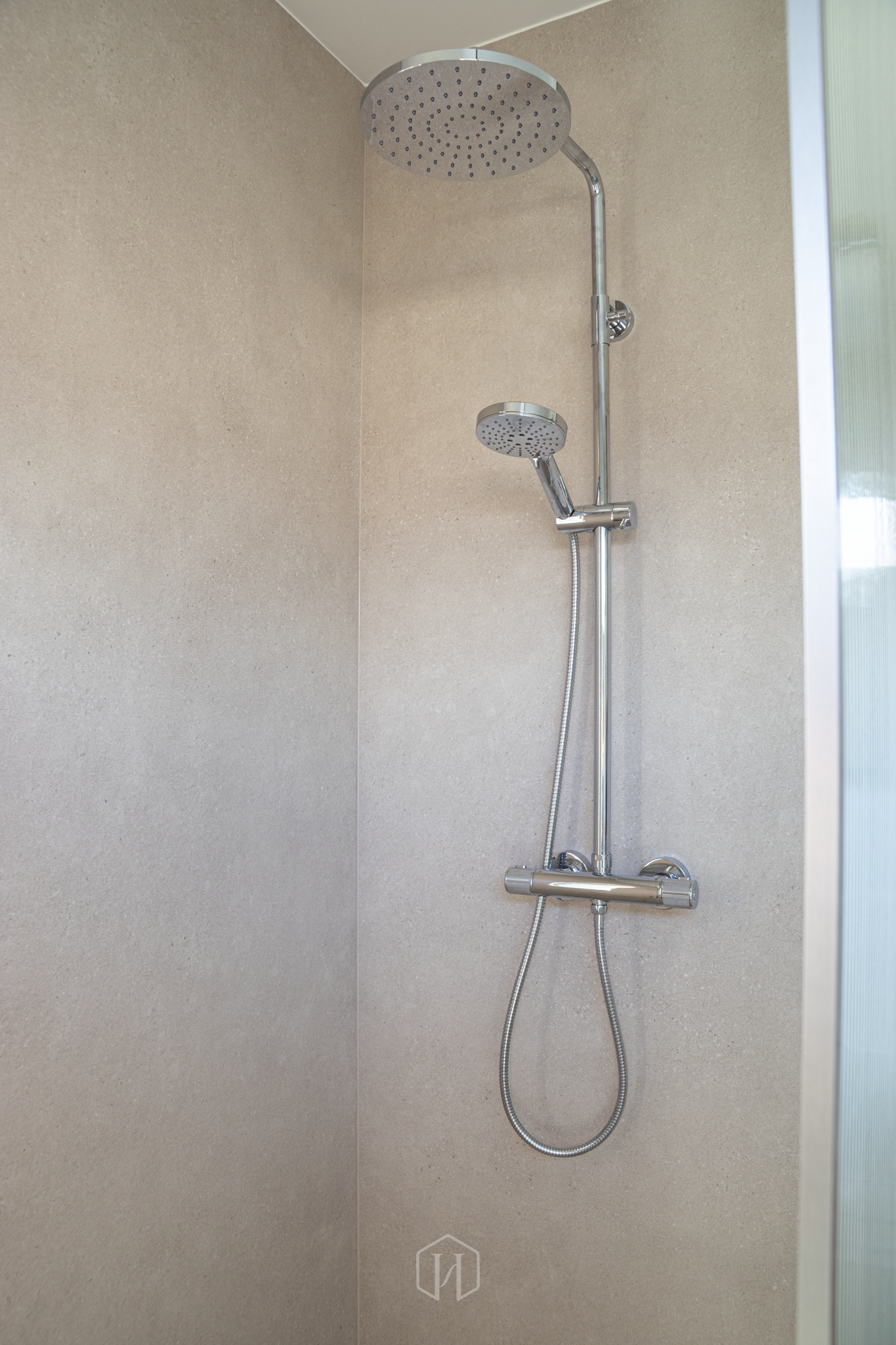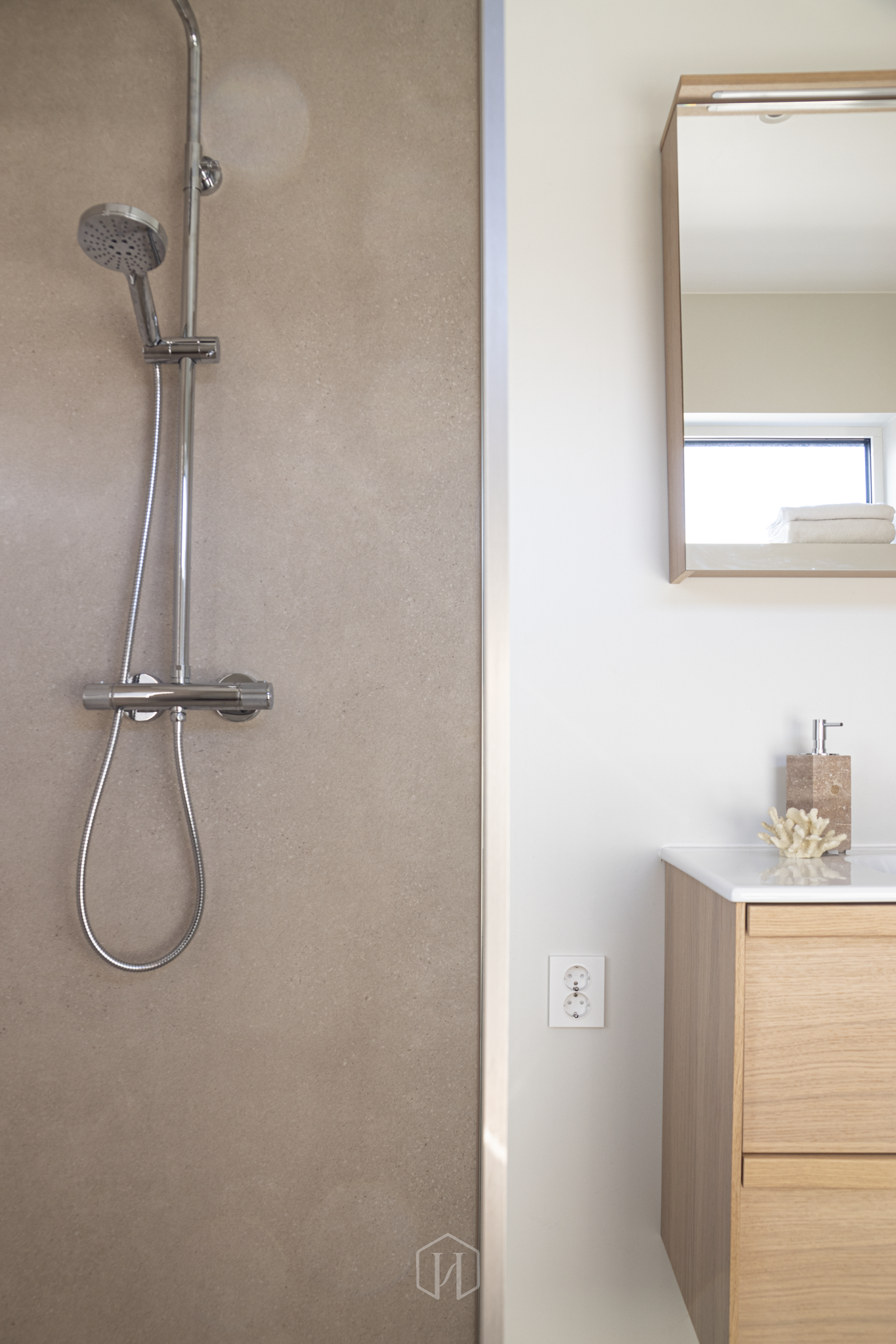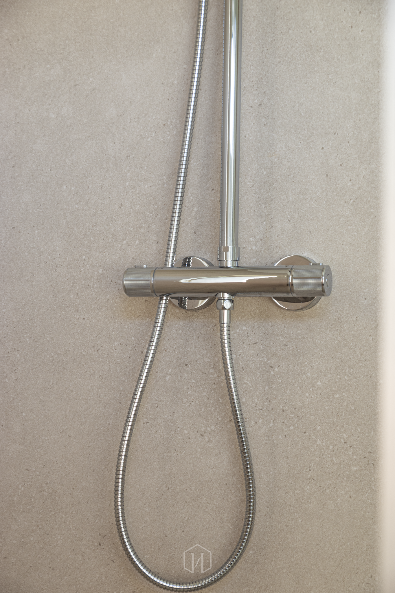 I dusjsonen brukte vi Bottega Caliza-fliser på vegger og gulv, som gir en helhetlig og rolig base. Dusjen er krom - tidløs, elegant og enkel å holde ren. Det øvre dusjhodet har raindrop-effekt, som gir en behagelig og avslappende dusjopplevelse. Dusjsonen er avskjermet med en dusjvegg i rillet glass, som demper vannsprut, slipper inn lys og bevarer romfølelsen.