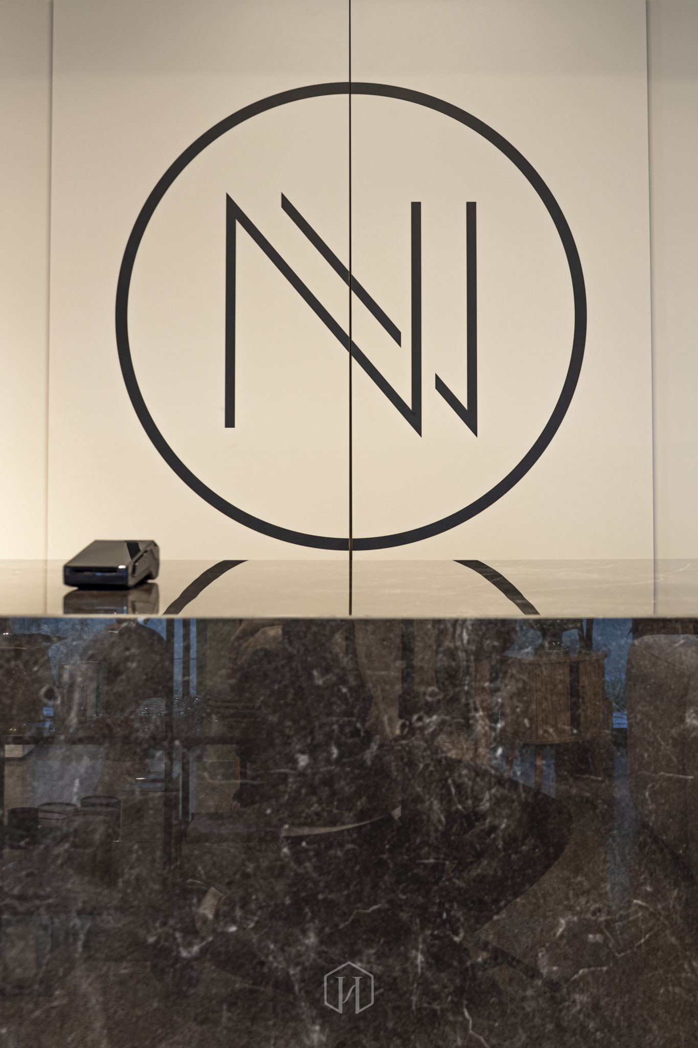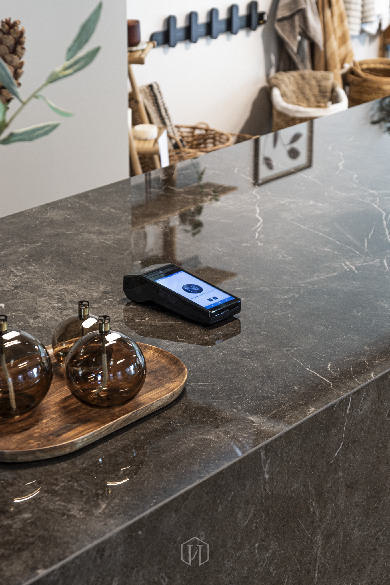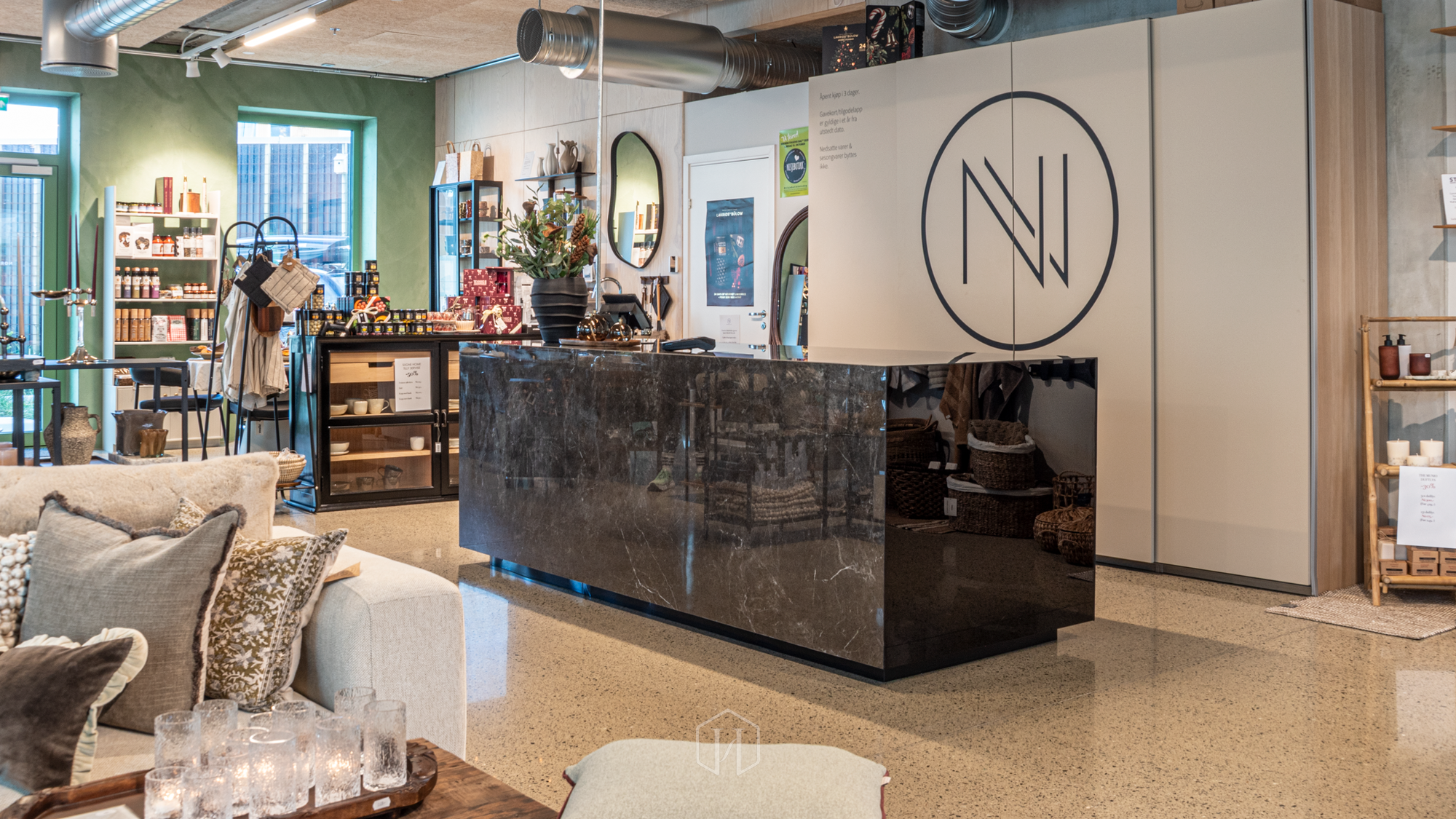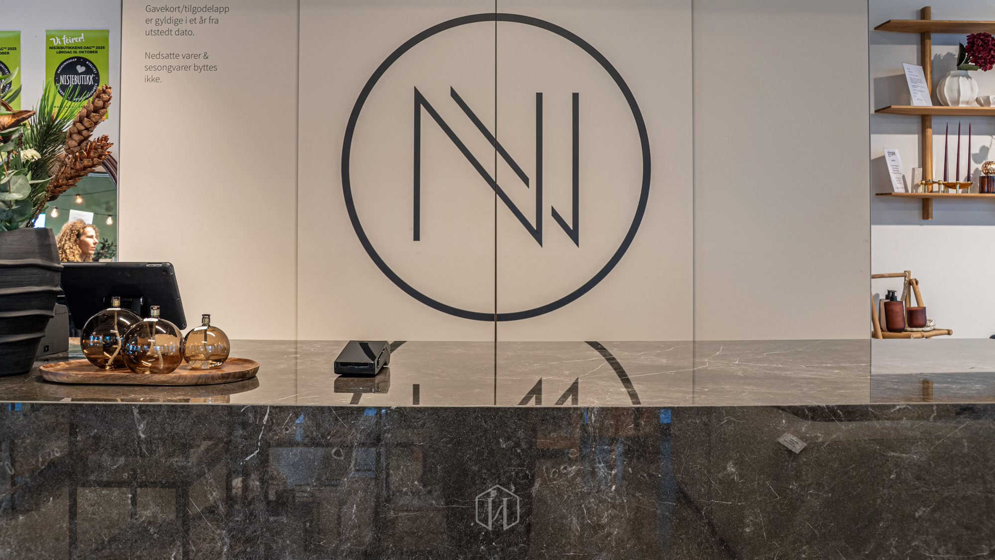 Målet var å skape en øy som kombinerer robust funksjon med et rolig, sofistikert uttrykk. Vi valgte XTONE fra Porcelanosa, storformat porselensfliser i polert utførelse for å få en monolittisk, presis geometr i som kler butikkens materialpalett og spiller på lag med den grafiske logoen.