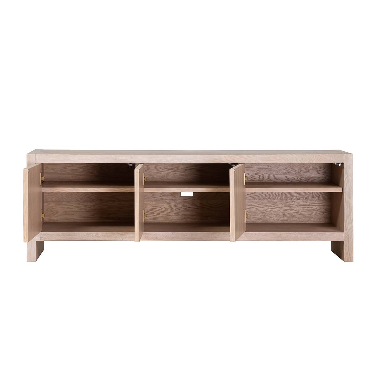 TV-benken fra den elegante møbelserie Mood er laget av finert eik og kombinerer funksjonalitet med stilrent design. Den er utstyrt med tre skapdører og en justerbar hylle på innsiden, som gir fleksibel og praktisk oppbevaringsplass. Serien Mood har et moderne, men tidløst uttrykk som passer sømløst inn i både klassiske og mer moderne hjem, og gjør det enkelt å skape en helhetlig og personlig innredning.